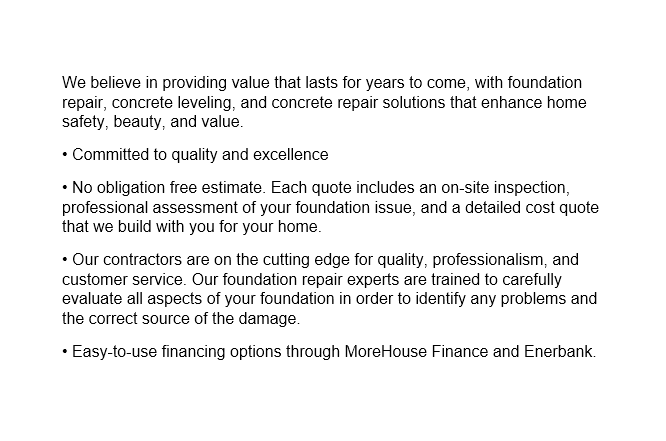 Maintaining a strong foundation is vital to maintaining the integrity of your home or business, so let us help you keep it up to date. We have been in business for over so many years and specialize in concrete repair, leveling and waterproofing throughout the Marksville area. We pride ourselves on being prompt, honest and efficient – always providing you with the highest quality service available.